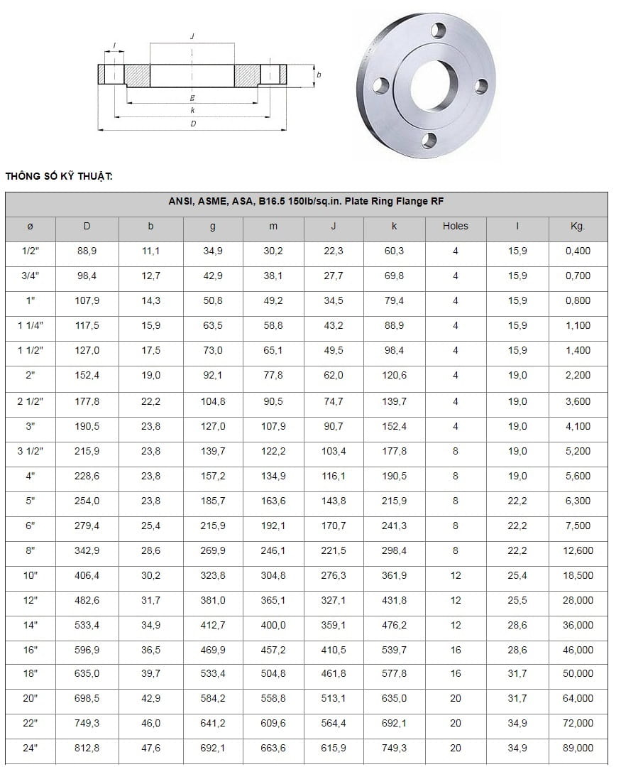 Dimension of ANSI 150 - B16.5 Plate Raised Face Flange