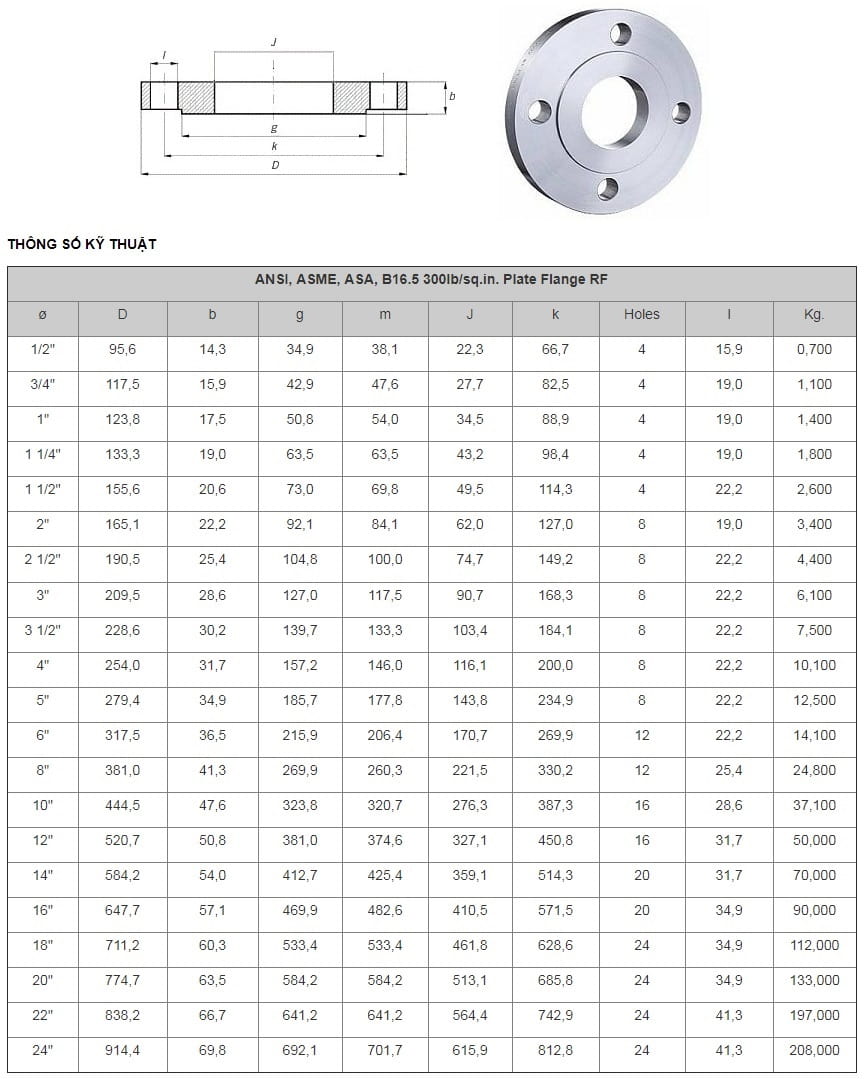 Dimension of ANSI 300 - B16.5 Plate Raised Face Flange