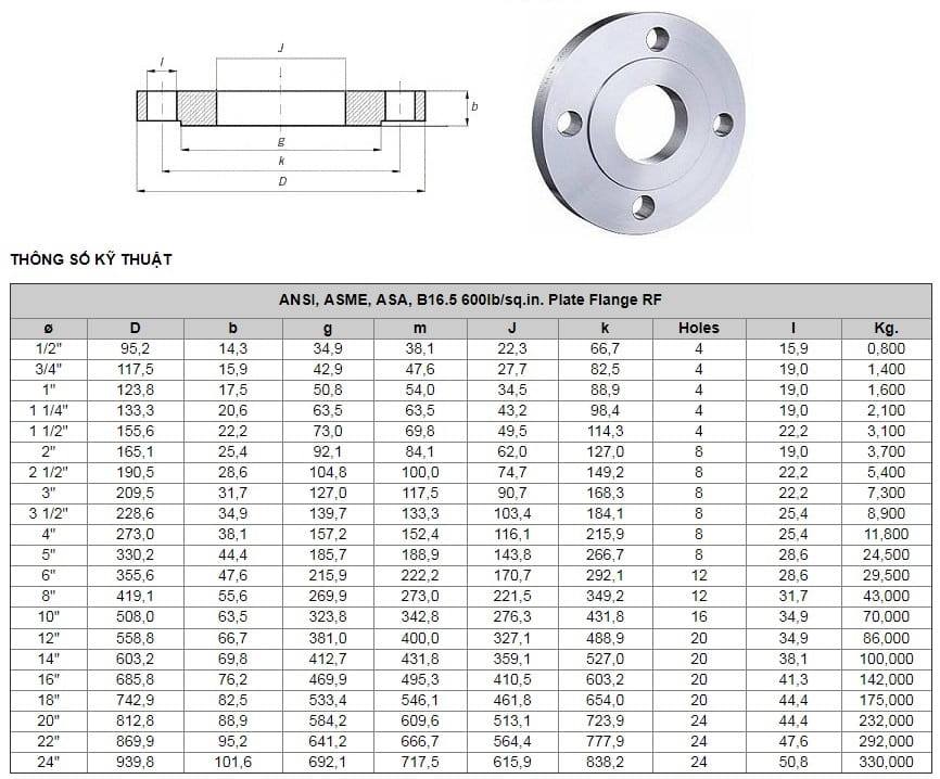 Dimension of ANSI 600 - B16.5 Plate Raised Face Flange