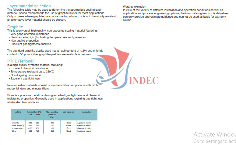 - Maximum temperature (Graphite filler): -200°C to 500°C