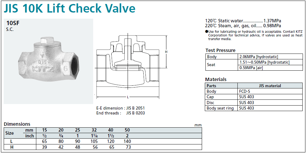 KITZ DUCTILE IRON LIFT CHECK VALVE, THREADED ENDS