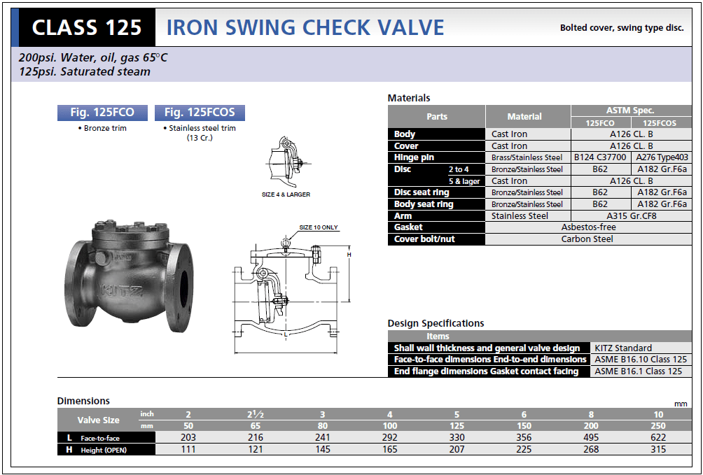 KITZ CAST IRON SWING CHECK VALVE, ANSI 125 FF FLANGED ENDS