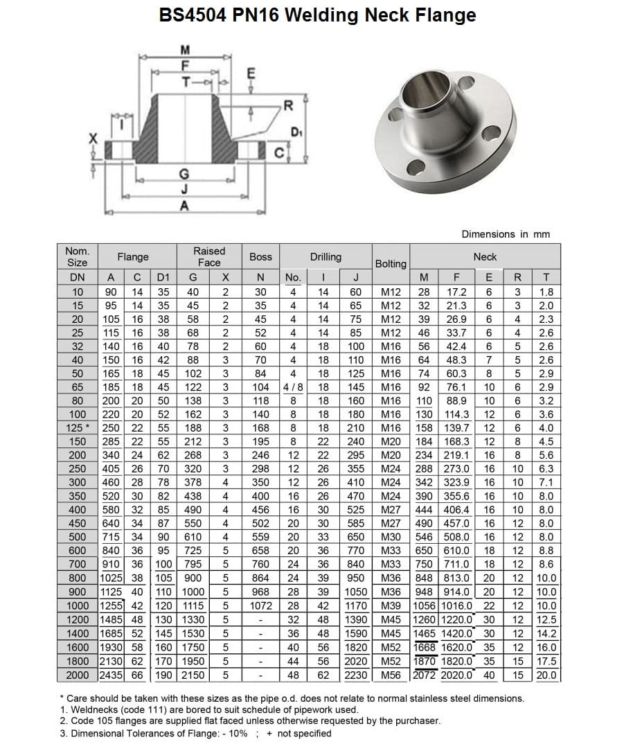 Dimension of BS4504 PN16 - Welding Neck Flanges