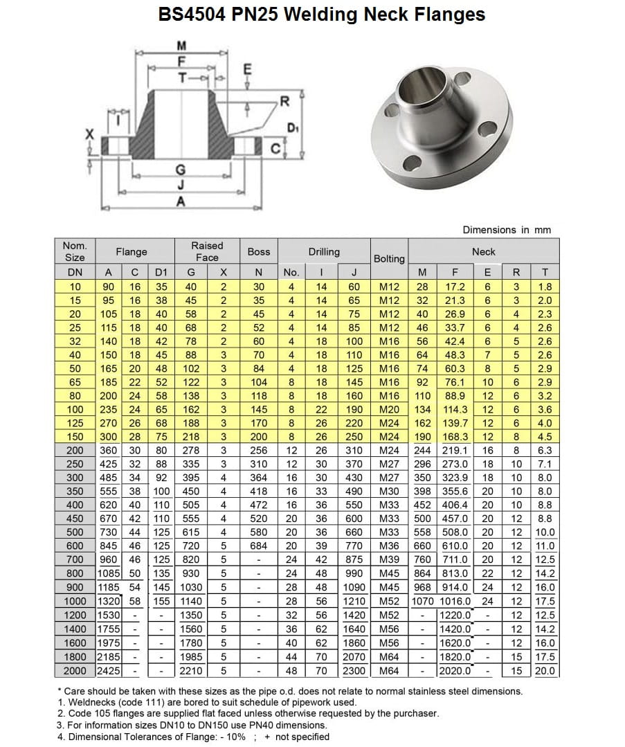 Dimension of BS4504 PN25 - Welding Neck Flanges