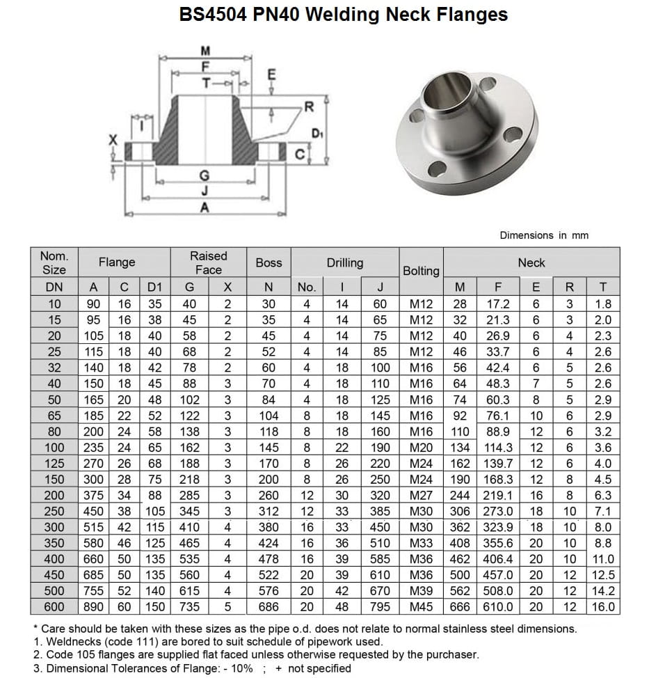 Dimension of BS4504 PN40 - Welding Neck Flanges
