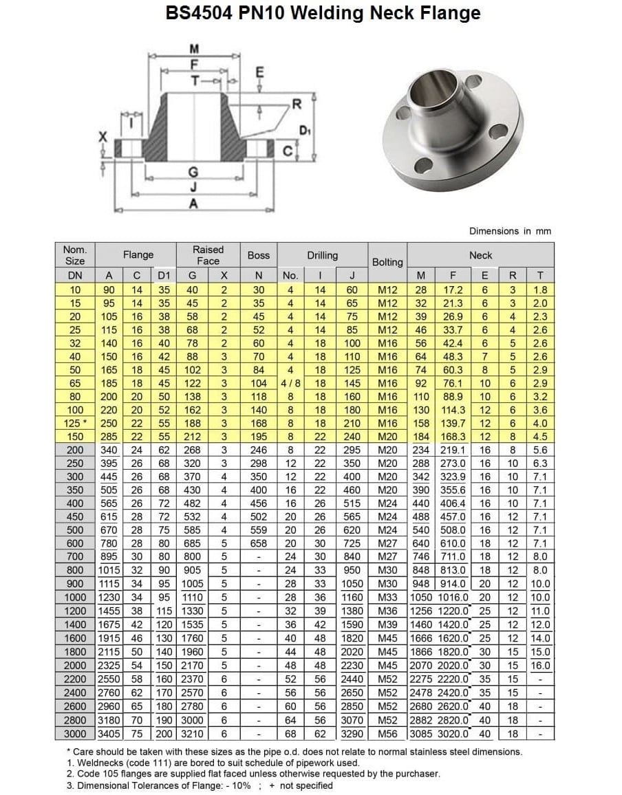 Dimension of BS4504 PN10 - Welding Neck Flanges