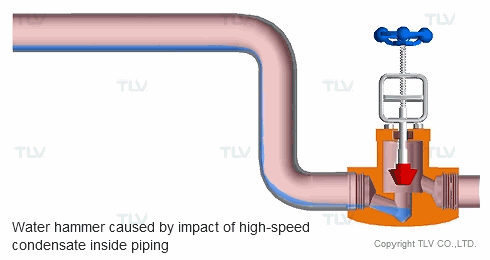 - Water hammer is a phenomenon that can occur in any piping system where valves are used to control the flow of liquids or steam. Water hammer is the result of a pressure surge, or high-pressure shockwave that propagates through a piping system when a fluid in motion is forced to change direction or stop abruptly. This shockwave is also commonly referred to as a hydraulic shock or hydraulic surge, and may be characterized by a marked banging or knocking sound on the pipes immediately after shutoff.