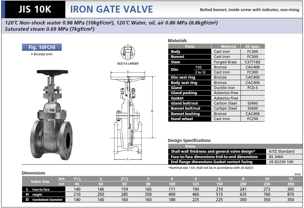 KITZ CAST IRON GATE VALVE, NON-RISING STEM, JIS 10K FF FLANGED ENDS.