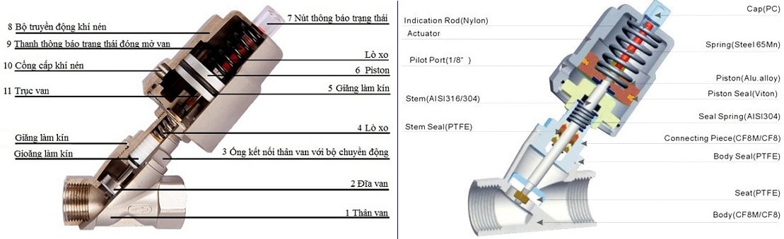 - Van Y Xiên Khí Nén Tác Động Đợn: Nguyên lý hoạt động của van xiên Y tác động đơn khá đơn giản: Ban đầu van ở trạng thái thường đóng. Khi cung cấp áp lực khí nén sẽ đẩy piston di chuyển. Piston sẽ đẩy đĩa van mở ra và cho lưu chất đi qua. Khi ngừng cung cấp khí, lực đàn hồi của lò xo sẽ tác động khiến van lập tức đóng lại.